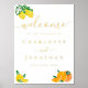 Modern Lemon and orange watercolor citrus wedding welcome gold foil poster. Unique watercolor painting of oranges and orange segments with green foliage and yellow lemons on a branch with greenery and lemon segments. Easy to customise stylish gold foil typography script with the bride and grooms name, the wedding date and your own welcome message. Original artwork by artist Catherine Sweetman