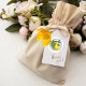 The sticker is made on wonderful paper and had no problem sticking to the bag that I purchased to put it on. I wanted to find a design that would be cute for the bride and groom and this one fit the bill as it has cute "bees" buzzing around and the wedding was taking place in a town called "Bee Cave". The packaging was great and protected the stickers. The website is easy to navigate and there are so many color choices. I had no problem finding a color that the bride was using on everything else selected. The design was adorable and there were many to choose from. You can make the figure as larger or smaller and you can place the photo and writting whereever you want to in the sticker. The printing is fabulous..better than expected.