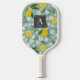 This cute pickleball paddle features a monogram and your name/text on a sky blue background with yellow lemon/citrus and white floral patterns. Personalise it for your needs.