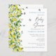 This is a modern citrus themed and budget friendly baby shower invitation. The design shows summery lemon tree branches, white flowers, green leaves and fluttering butterflies.