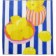 A vibrant still life featuring bright yellow lemons in playful pink and orange bowls. Bold blue and white stripes in the background add a fresh, Mediterranean feel. A perfect pop of colour for citrus lovers and modern art enthusiasts!