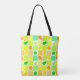 A fun tote with a colourful citrus fruit pattern of lemons, limes, oranges and citrus slices on squares of white, orange, teal and yellow.