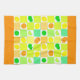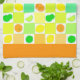 A kitchen towel with a colourful citrus fruit pattern of lemons, limes, oranges and citrus slices on squares of white, orange, teal and yellow with orange borders.