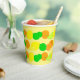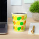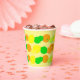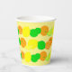 A citrus fruit paper cup with a colourful pattern of lemons, limes and oranges on a light yellow background.