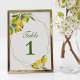 This two-sided table number card features a watercolor lemon motif accented by a geometric frame and vibrant green lettering. A wonderful design for your lemon themed event. Made from sturdy cardstock, so it may be used on a stand or in a frame.