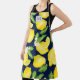 This monogram apron features a botanical lemon pattern with a navy band and a square for initial at the top.