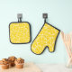 This pot holder and oven mitt set features a pattern of overlapping lemon slices for a fun, zesty look.