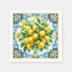 Party paper napkins are shown in the white cocktail size with an art print of a mediterranean lemon tile.