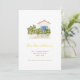 A charming new address/new home announcement with a watercolor illustration of a white and blue bungalow house with lemon trees and a white picket fence.