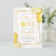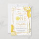 This citrus themed lemonade first birthday party invitation features a gold geometric frame adorned with watercolor lemons. The word "ONE" appears in yellow capital letters with a watercolor lemon slice in place of the "O." Add your little sweetie's name and birthday in modern yellow handwriting script and the party details in charcoal grey sans serif. The back of the card is solid yellow. An ideal theme for a summer birthday party!