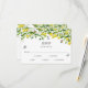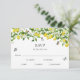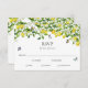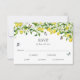 Elegant, simple and summery, this lemon themed wedding RSVP response card features a brightly coloured branches or lemon trees, white florals and butterflies.