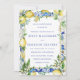 Yellow lemons and white flowers decorate Italian blue mosaic tiles to create an elegant citrus wedding invitation.