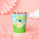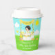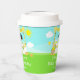 This cute and whimsical paper cup features a black hair boy with fair skin at a yellow lemonade stand which is decorated with flowers and bunting. In the background is a blue sky, sunshine and butterflies. The text combines decorative and sans serif fonts for a stylish and modern look. This is perfect for a summer birthday party.