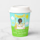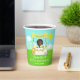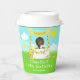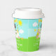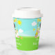 This cute and whimsical paper cup features a black hair girl with dark skin at a yellow lemonade stand which is decorated with flowers and bunting. In the background is a blue sky, sunshine and butterflies. The text combines decorative and sans serif fonts for a stylish and modern look. This is perfect for a summer birthday party.