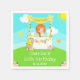 This cute and whimsical napkin features a red hair girl with fair skin at a yellow lemonade stand which is decorated with flowers and bunting. In the background is a blue sky, sunshine and butterflies. The text combines decorative and sans serif fonts for a stylish and modern look. This is perfect for a summer birthday party.