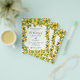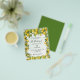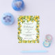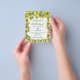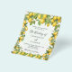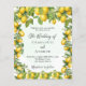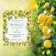 A green watercolored background. Decorated with yellow lemons and green foliage. Personalise and add your names and details. The name is written with a hand lettered style script.