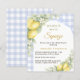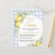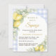 Celebrate your upcoming bundle of joy with this elegant lemon-themed baby shower invitation. Featuring a soft dusty blue and white gingham background, delicate watercolor lemons, fresh greenery and a blue bow, this design creates a warm and inviting atmosphere perfect for a summer or citrus-inspired baby shower.