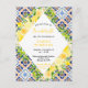 This fun and whimsical birthday party postcard features watercolor citrus lemons and foliage on a Mediterranean tile background. The text combines handwritten script and serif fonts for a stylish and modern look. This is perfect for a summer rustic birthday party.