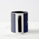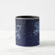 Mug featuring the zodiac symbol for Leo in soft silver blue, overlaid with the stars of the constellation, against a starry sky background graded from deep midnight blue to black
