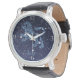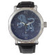 Watch featuring the zodiac symbol for Leo in soft silver blue, overlaid with the stars of the constellation, against a starry sky background graded from deep midnight blue to black.