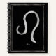 Stylised hammered silver Leo the Lion astrology zodiac birthday symbol in a hand drawn silver fine double line frame. A hardcover or softcover notebook with your choice of inside pages. Choose from sketchbook, bullet journal, checklist, graph paper, recipe book, or lines in various widths and colours. Customisable. Aquarius text in a fine script on the front cover can be personalised, text can also be added on the back.