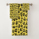 Wild Leopard animal print pattern bathroom towel set. Exotic safari print design with yellow or custom colour background. Elegant home decor for bathroom, toilet, guest house, cabin etc. Includes little washcloth, small hand towel and big bath towel. Holiday gift ideas for friends, family, couple, newlyweds etc. Add your own monogram or family name optionally.