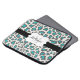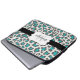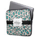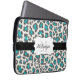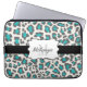 Leopard print design neoprene laptop sleeve in aqua, grey, and white with a black stripe, white edged with black banner you can personalise with your name and monogram initial!