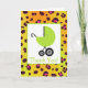 A baby shower thank you card featuring an illustration of a green baby carriage over a background of orange leopard. Inside is blank.