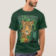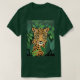 Tee in a leopard with bright, intense eyes peering through lush green foliage. The sharp contrast between the leopard's spotted fur and the vibrant leaves creates a striking visual effect.