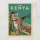 Unique Antique Style Aviation Travel poster from Kenya featuring a spotted Leopard or panther painting amongst tropical leaves on an deep Aqua blue background