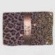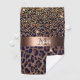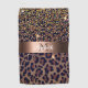 Elegant, cool, glamourous and feminine with brown, golden and black leopard pattern, decorated with golden confetti. A large faux bronze coloured band. Add your name, written with a modern hand lettered style script. White letters. And your monogram letter in black.