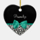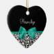 Personalise by adding the name of any girly girl to this trendy black and white leopard print heart-shaped ornament with a girly emerald green ribbon tied into a cute bow. This stylish animal print design is a flat printed image, and does not contain actual ribbon.