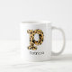 Personalise this custom leopard print lowercase letter "p" coffee mug by adding a name. The options to change the colour of the text for the name, its size, and type of font are available.