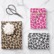 Wrapping paper in a digital textile print in a textured leopard pattern - leopard spots in black, accented with rust, on a tan / beige background, deep fuchsia pink, accented with hot pink, on a pastel background, and black, accented with silver grey / grey, on a white background