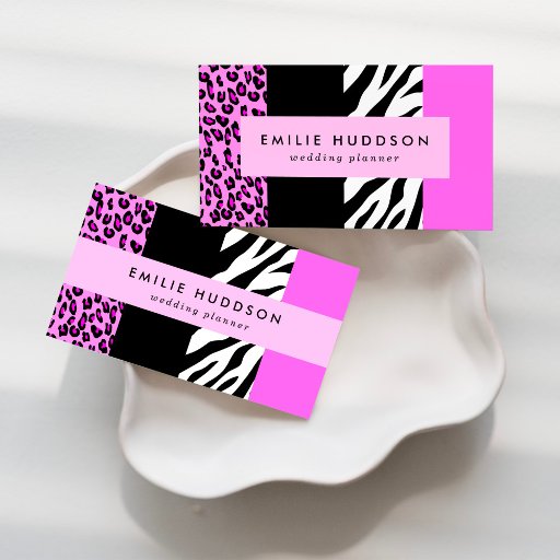 Elegant, stylish and sophisticated business cards with leopard and zebra pattern in pink colour. Modern and trendy design, perfect for animal print lovers.