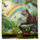 A stunning leopard reclines on a rocky perch amidst lush greenery, surrounded by colourful butterflies and blooming flowers, with a radiant rainbow arching across the sky.
