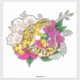 A leopard gecko sits amongst flowers and henna in. a backdrop of green