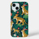 Leopards wearing feather headdresses, surrounded by tropical flowers and leaves in a dense jungle setting, vibrant colours, playful design.