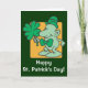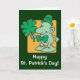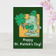 This funny St. Patrick's Day design features a little green leprechaun wearing a green bow tie and a green hat and carrying a big green shamrock.