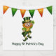 A cute cartoon illustration of a ginger haired leprechaun doing a jig at finding a lucky shamrock. He is standing below festive orange and green bunting that has templates for your personalised wording.