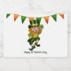A cute cartoon illustration of a ginger haired leprechaun doing a jig at finding a lucky shamrock. He is standing below festive orange and green bunting that has templates for your personalised wording.