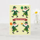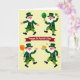 This card shows four stylized leprechauns arranged in a neat grid on a soft cream background, creating a friendly, balanced scene 💚. In the middle, a deep red banner stretches horizontally with “Happy St. Patrick’s Day” set in light-colored lettering that stands out clearly. Each leprechaun wears shades of green—emerald coats, lighter green trousers, and tall green hats with gold buckles—along with rosy cheeks and full white beards. Their open mouths and lifted feet make them look like they’re singing together, and a couple of them angle their bodies toward each other as if sharing a joke mid-dance ☘️. One leprechaun holds out welcoming arms, another raises a green balloon and a three-leaf clover, and a third waves beside an orange balloon for contrast. The last leprechaun lifts a foamy mug of beer, with a small shamrock floating nearby near the top edge. The cream backdrop stays uncluttered while the red banner and green outfits keep the focus centered on the four figures.