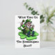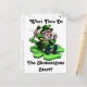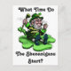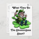 An Irish leprechaun sitting on a shamrock clover. He's asking 'What time do the shenanigans start? Great for St. Patrick's Day!