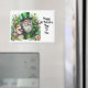 Sweet picture of a leprechaun holding a dog, is featured on this magnet for St. Patrick's Day. With message, "Happy St. Patrick's Day To You", this would make a cute decoration for the Irish holiday. Makes a nice little gift too!