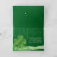 Two miniatures of Leprechauns + four-leaf clover + stylised green hills + St Patrick's Day. Design on horizontal greeting card with texts to customise inside with the same clover and hills.