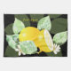 Lemons nestled in variegated green leaves on a black and green speckled background.