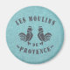 Round magnet with an image of blue burlap with grey roosters and the text “Les Moulins De Provence” in grey. See the entire Cancan Magnet collection in the PARTY FAVORS section.