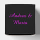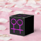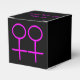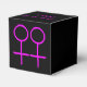 This awesome favour box is designed for lesbians. It features two pink female symbols standing side by side. The background is black. There is customisable text on the top of the box to put the names of the happy couple..