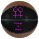 This awesome basketball is designed for lesbians. It features two pink female symbols standing side by side. The background is black. There is customisable pink text below the symbols to put names.