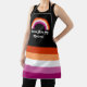 Women's apron with an image of a lesbian pride flag and a rainbow; pink, white, and orange design on a black background, with a customisable text template for your own name or message